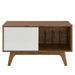 Elevate your living space decor with the Envision Vinyl Record Display Stand. Featuring an elegant linear silhouette, Envision is crafted with walnut grain laminate over durable fiberboard for reliable support and features a sliding white door to offer ample storage space. Keep media essentials concealed and organized while displaying your vinyl record collection with Envision. Supported by flared and tapered legs, update your living space decor while keeping your visual space clean with this versatile display stand.