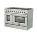 The 48 Inch Forno Galiano Gas Range brings professional styling and performance into your home kitchen with its durable stainless-steel design. The cooking surface has 8 sealed burners with a total output of 107,000 BTU, which one is a 20,000 BTU dual-ring burner that can simmer at 1,000 BTU. Continuous cast iron grates ensure stability on the enamel surface. The main oven of 4.32 Cu.Ft has a convection fan with 30,000 BTU Total Broil and Bake output. The secondary oven has a capacity of 2.26 Cu.Ft. with a 14,000 BTU Bake output. Both ovens have an impressive enamel interiors allowing for easy cleaning and 3-layer glass oven door window provides both heat retention and an unobstructed view. It features 2 racks per oven, reversible griddle, an LP conversion kit, and durable zinc-coated metal knobs. Elevate your kitchen with performance, convenience, and enduring elegance.