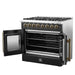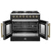 Our 36" Galiano Dual Fuel French Door Range blends timeless design and high performance. Featuring a sleek black finish and antique brass knobs, this range adds sophistication to any kitchen at an affordable price. The cooktop boasts six sealed burners with a total output of 83,000 BTU, including a 20,000 BTU dual-ring burner ideal for boiling, searing, or simmering delicate sauces. The heavy-duty cast iron grates provide a stable surface and allow you to slide cookware effortlessly across the cooktop. Its spacious 5.36 cu.ft. true convection oven delivers even heat distribution, powered by 6,300 watts, for perfectly baked and roasted dishes. Easy-to-clean black enamel interiors, French door convenience, and included electroplated racks make this range as practical as it is beautiful. Complete with an LP conversion kit and NEMA 14-50 power cord, the Galiano Range is built for both style and efficiency.