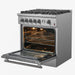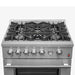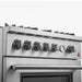 The all-stainless steel finish, paired with a pro-style handle and zinc-coated metal knobs featuring decorative bezel rings, offers a sleek, professional look.