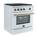 Infuse your kitchen with timeless elegance and reliable performance with the Marco 30 Inch Alta Qualita Gas Range in white with antique brass accents. Tailored for creative cooks, this range features 4 sealed burners with a total of 37,000 BTU, including a dual-ring burner for tasks like simmering soups or searing meats. The 4.32 cu.ft. convection oven delivers evenly cooked dishes, helping you achieve perfection every time. Durable cast iron grates ensure cookware stability, and the oven’s sleek black enamel interior is easy to clean. Let the Marco elevate your home cooking. Lower the cost of living with Forno.