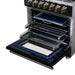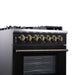 The Massimo 30 Inch Dual Fuel Range in Black with Antique Brass Accessories blends professional performance with modern design. The cooktop features 4 powerful sealed gas burners and durable matte cast iron grates, along with a built-in wok ring support and removable griddle for flexible cooking. The 4.32 cu. ft. oven offers true convection baking and broiling, low bake, and high bake functions for precise heat control. Equipped with a dual-element broiler, steam-clean interior, and a speckled blue enamel oven cavity, it also includes an air fryer basket for healthier cooking. This freestanding or built-in range is LP convertible and comes with a matching antique brass trim kit.