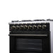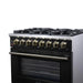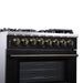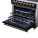 The Massimo 36 inch dual fuel range delivers powerful performance with elevated style. It features six sealed gas burners and matte cast iron grates, plus included accessories like a wok ring and removable griddle. The 5.36 cu. ft. electric oven offers true convection cooking, dual-element broiling, and five baking modes for maximum versatility. Designed in a bold black finish with antique brass handles, this range includes a built-in air fryer basket, steam-clean oven, and a speckled blue enamel interior. LP gas convertible and suitable for both freestanding or built-in installations.