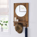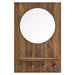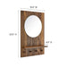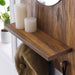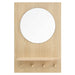 A good combination of form and function, Glint is a stunning round mirror with a rectangular wood frame, shelf, and four pegs, and is a must-have for the entryway, hallway, or mudroom. Not only does it offer a touch of modern style and elegance, but it also provides organization and storage for keys, dog leashes, hats, and a variety of other small items. Crafted from mindi wood and particleboard with a wood grain laminate, this all-in-one wall mirror is made to last and brings an extra touch of character to any home or apartment. Its sleek, modern design and wood grain aesthetics are sure to turn heads and make a statement. Minimal assembly required.