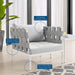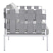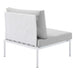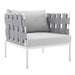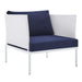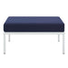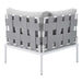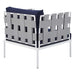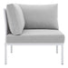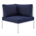 Engage life with Harmony. Enjoy casual conversation under the open sky with an all-weather waterproof furniture set that delivers an exceptional outdoor porch, patio, balcony or garden experience. An exceptional modern furniture set that exceeds expectations, Harmony comes with long-lasting machine washable Sunbrella® fabric cushions, silk polyester seat back weave, square powder coated aluminum bases, tempered glass top tables, and non-marking foot caps. A sectional that arranges according to the spontaneous needs of your guests, set your sights on open and inspired moments with the Harmony Outdoor Patio Collection. Set Includes: 2 Corner Chairs, 1 Armless Chair, 1 Ottoman, 1 Armchair, 1 Side Table
