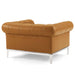 Rollick in the luxurious expanse of the Idyll Leather Chesterfield Loveseat and 2 Armchair Set. Featuring soft leather upholstery, rolled arms and tufted button accent details, dense foam padding, and a sinuous spring system for responsive support, Idyll creates a lushly comfortable seating environment that invites lingering conversations and leisure time. Supported by a sturdy polished stainless steel frame, enhance your living room decor with the timeless look of this vintage set.