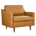 Rejuvenate your living room or apartment decor with the Impart Upholstered Genuine Leather Armchair. Smartly upholstered in durable, genuine top-grain leather with French piping detail, this modern armchair enlivens mid-century modern, eclectic, or minimalist living spaces. With a softened silhouette from the armrest sloping gently upward then leveling to join the sturdy backrest, the Impart Genuine Leather Armchair brings charisma and elegance to small-space living. A superior spring coil support system and dense foam padding provide enduring comfort in your living room, entryway, or lounge space. Carried robustly on four sturdy, round tapered, walnut-stained rubberwood legs with black foot caps, this comfortable reading chair adds distinction to your home office. Shipping in a portable box for easy maneuvering, the Impart Living Room Accent Chair comes with easy-to-follow directions; a charming addition to a small-space living room or apartment. Armchair Weight Capacity: 331 lbs.