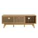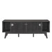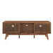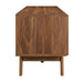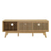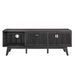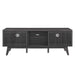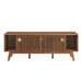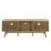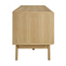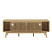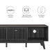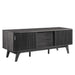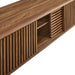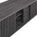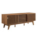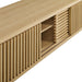 Reclaim modernity in your living space with the Iterate 59" TV Stand. This low-profile entertainment center features three sliding slatted doors, organic aesthetics, and a sleek silhouette to bring contemporary style to your living room, bedroom, home office, or lounge area. Crafted from durable particleboard and wood grain laminate, this TV stand offers spacious storage for all your media essentials with open shelving and a special area to store and display vinyl records or DVDs. The metal partitions are easily removed to allow for open storage space if preferred. With cable managment holes to keep visual space clean, this media console accommodates TVs up to 65 inches. Includes non-marking foot pads to protect flooring. Assembly required. Weight Capacity: 200 lbs.