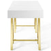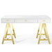 Introduce the sleek retro modern style of the Jettison Office Writing Desk to your office and lounge room decor. The Jettison Office Desk features a smooth MDF white high gloss surface with three sliding drawers for a writing surface that inspires creativity and expanse. Blending vintage glamour style with sleek modern metal, the gold stainless steel sawhorse legs produce a unique office desk that will enhance any decor. Jettison Office Desk stands at 29.9 inches for a minimalist piece with a flair for your office, bedroom, living room, lounge room or other workspace area.