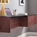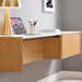 A perfect workspace for the home office, college dorm, bedroom, living room, or any other work area, the 3-Piece Kinetic Wall-Mount Office Furniture Set introduces style and function to the modern home or apartment. Crafted from durable, lightweight particleboard with a complementing melamine top, this office desk features a spacious work area and flip-up cable management compartment to keep things neat and organized while the wall-mount storage cabinet is complete with magnetic-close doors to conceal its shelved storage area. With an organic wood grain design, this wall-mount office desk, storage cabinet, and accent shelf brings natural elegance to any space and mounts directly to the wall to save valuable floor space. Assembly required.