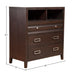 The Legacy wood bedroom media chest features a classic black cherry finish. Alpine Furniture takes pride in the quality of their product, crafted with Plantation Mahogany Wood Solids & Okoume Veneer. 3 drawers for storage feature ball bearing metal drawer glides and French & English Dovetail construction with a felt lined top drawer. Holes in open storage area for electrical wires.