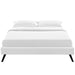 Accelerate your bedroom decor with the Loryn Platform Bed. Made with a solid wood frame upholstered in vinyl, Loryn features tapered wood legs, plastic foot glides, ten sturdy wood slats with a centered supporting bar and two support legs for enhanced stability. Due to the wooden slat support system, the use of a box spring is unnecessary. Loryn supports memory foam mattresses such as our Aveline series, and is compatible with one of our headboard styles: Jessamine, Terisa, Laura, Phoebe, Camille, and Josie. Perfect for mid-century modern, minimalist and contemporary bedrooms. Mattress not included.