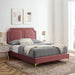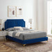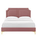 Cultivate an inspiring and upscale aesthetic in your master bedroom or guest room with the refined Novi Performance Velvet King Bed. The upholstered headboard is built with a solid plywood frame with artfully notched corners. The soft silhouette of the modern headboard is enhanced by the precise nailhead trim for glam deco style in mid-century modern or eclectic decors. This king-sized platform bed is tailored in stain-resistant performance velvet and features a well-crafted MDF frame granting an enduring foundation for memory foam, innerspring, latex, and hybrid mattresses. A durable poplar wood slat support system ensures strength and steady support, eliminating the need for a box spring. The slatted bed frame has a reinforced center beam with two support legs for enhanced stability. Novi stands on gold metal legs with non-marking foot caps. Assembly required. Weight Capacity: 800 lbs.