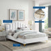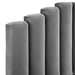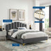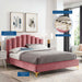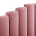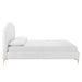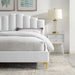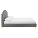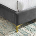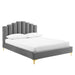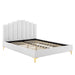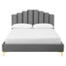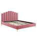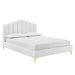 Instill luxurious style and comfortable sleep in a master suite or guest bedroom with the Olivia Performance Velvet Queen Platform Bed. Abounding in glam deco style and vintage charm, the upholstered headboard of this queen bed features a modern twist on classic channel tufting with velvety panels ascending upwards in an arching design. The padded queen headboard and side rails come upholstered in soft, stain-resistant performance velvet upholstery that grants rich texture to the elegant form. Resting atop gold metal legs with non-marking caps, this platform bed frame is a sturdy mattress foundation with a wood slat support system that eliminates the need for a box spring and promotes healthy air circulation for memory foam, latex, innerspring, and hybrid mattresses. Assembly Required. Bed Weight Capacity: 800 lbs.