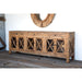 Crafted from reclaimed pine, this country club sideboard is rustic yet elegant, featuring glass pane doors with wood cross designs and 3 service drawers.