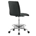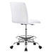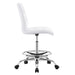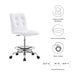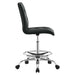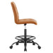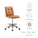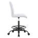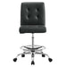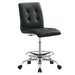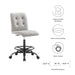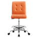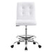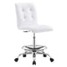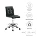 Etiquette presides over the properly styled Prim Armless Drafting Chair. Modern and luxurious, this swivel drafting stool features deep biscuit tufting, durable vegan leather upholstery, and elegant piped trim for added finesse. This vegan leather drafting chair is height adjustable, features a 360º swivel, and comes outfitted with a matte black base with five dual-wheel nylon casters. Perfect for standing desks, drafting tables, reception desks, and more, this drafting-height office chair is complete with dense foam padding for lasting comfort throughout the workday. Assembly required. Weight Capacity: 287 lbs.