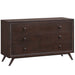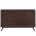 A vintage look and rich mid-century design adorn the Tracy bedroom dresser. This finely crafted toffee brown stained piece comes with three easy-glide storage drawers, antique finish metal handles, and outstretched platform legs. Built upon solid edging and craftsmanship techniques, the Tracy dresser requires assembly and wipes clean with a dry cloth.
