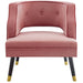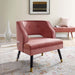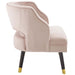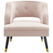 Curving fluidly with subtle piping details and hints of depth with a single row of button tufting, Traipse Performance Velvet Armchair is an elegant addition to your living room decor. Traipse is a vintage glamour style accent chair that will create a conversation and lingering guests as they relish the comfortable embrace. Dense foam padding and luxuriously soft, stain-resistant performance velvet upholstery cover Traipse. Solidly constructed from wood and plywood, Traipse rests securely on four splayed dark walnut wood legs with non-marking foot caps. Traipse creates depth and visual appeal with a slightly open back and subtly rounded cascading arms. Ideally suited for any office, bedroom, living room, and lounge room, Traipse Performance Velvet Accent Chair gracefully enhances your vintage glamour, bohemian, traditional, or modern decor. Chair Weight Capacity: 300 lbs.