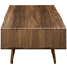 Harness the iconic energy of mid-century modern style with the Transmit Coffee Table. Transmit features a full-extension white lacquer drawer with abundant concealed and open storage, durable particleboard with smooth walnut grain laminate and four tapered dowel wood legs. Display and store your magazines, books, pictures, keys, glasses, and favorite beverages on this contemporary coffee table.