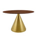 Connect with family and friends over good food and conversation with the Tupelo 48" Dining Table. Inspired by modern style and mid-century influence, this pedestal table reflects an organic shape and is perfect for entertaining or everyday dining. This dining table rests on a conical polished gold metal pedestal base and features a 48" tabletop crafted with MDF with an easy-to-clean wood grain veneer. Non-marking ring to protect flooring. Assembly required.