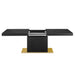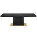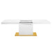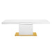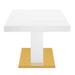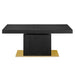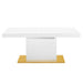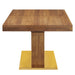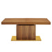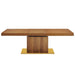 Reimagine your dining decor with the Vector Expandable Dining Table. Tailored for all occasions from intimate dining to festive gatherings, the organic wood grain surface on this dining table is perfect for haute cuisine and home cooking. Featuring durable fiberboard construction, wood veneer, a gold stainless steel base, a butterfly leaf with a lock that collapses inside the distinguished columnal base with ease, and non-marking foot pads to help protect your flooring, Vector comfortably seats up to eight people and extends from 71 to 94.5 inches.