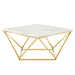 Redefine your home decor with the geometric design of the Vertex Coffee Table. A glamorous coffee table with modern appeal, this living room coffee table features intersecting lines to form triangular shapes that create the polished gold stainless steel base. A beautiful complement to the gold design, this coffee table boasts a square artificial marble tabletop to complete the look. Resting on non-marking foot caps, this artificial marble coffee table is perfect for the living room, lounge room, office, den, or bedroom sitting area. Assembly required.