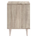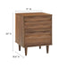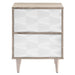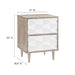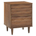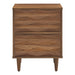 The Vespera Two-Drawer Nightstand brings contemporary modern intrigue to the bedroom featuring a grooved wave design on the front, tapered legs, and concealed storage space. Functional, beautiful, and streamlined, this modern nightstand stores bedside essentials without sacrificing style. A sturdy mindi wood and particleboard construction with a wood grain finish make it a durable bedside table. Two full-glide drawers provide ample storage space and non-marking foot glides protect your flooring. Easy to follow assembly instructions included. PLEASE NOTE: For the greatest design pattern effect, please place the product in a well-lit room.