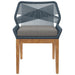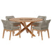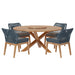 Enjoy the company of family and friends or a peaceful morning of relaxation gathered around the Wellspring 5-Piece Outdoor Patio Dining Set. Crafted with premium solid teak wood that is naturally weather-resistant, this round outdoor table features a contemporary trestle base situated on non-marking foot pins to protect outdoor flooring. This dining table boasts a beautiful wood grain and a removable lazy Susan for easy serving. Measuring 63" in diameter, the outdoor table is complete with four patio chairs featuring a premium solid teak wood base with stretchers and non-marking foot pins. These patio chairs boast woven rope detail on the aluminum seat frame, a crisscross pattern along the backrest, and removable cushions with dense foam padding and ties to ensure a secure seat. The Wellspring Dining Set is a charming addition to a backyard, patio, porch, deck, or poolside. Assembly required. Chair Weight Capacity: 220 lbs.