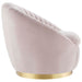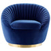 Spin around and take in your surroundings with the Whirr Tufted Performance Velvet Swivel Chair. Perfect for the living room, entryway, bedroom, office, or other seating area, this accent chair features vertical channel tufting, rich tactiles, gold metal detail, and a beautifully curved silhouette. Covered in stain-resistant performance velvet, this upholstered chair is a premium seating experience complete with dense foam padding and a spring support system. This swivel chair rests on a gold metal swivel base so you can effortlessly maneuver to your position of choice. Weight Capacity: 300 lbs.
