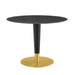 Gather family and friends for good food and conversation around the Zinque Dining Table. Bringing modern influence and mid-century inspiration to your dining space, this pedestal table reflects an organic shape. Perfect for entertaining or everyday dining, this dining table rests on a black and polished gold tapered base and features a 40" artificial marble tabletop with an easy-to-clean coating. Non-marking ring to protect flooring. Assembly required.